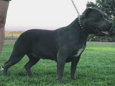 The beautiful Blue/Ghost Tri girl is 77LBS and is registered with the ABKC.