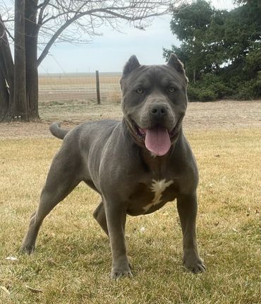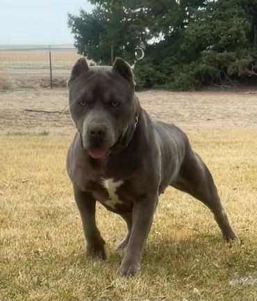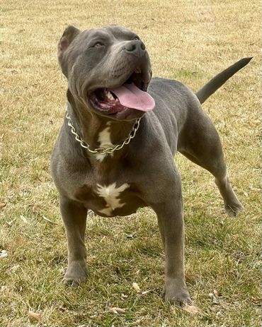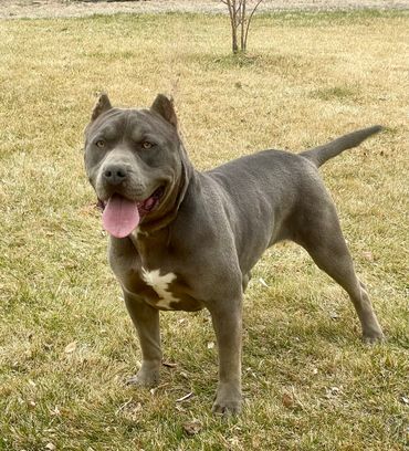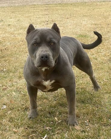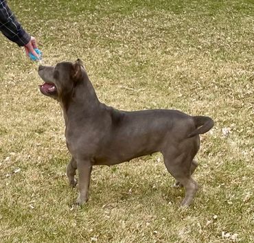 Ms. Polly is pushing 90+ LBS of Bold & Beautiful! Her stunning blue coat and piercing green eyes turn heads all day long. She is dual registered with the UKC & ABKC.